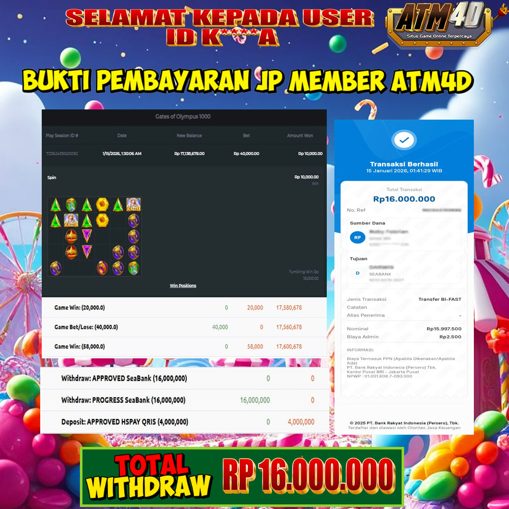 Jangan lewatkan kesempatan untuk meraih kemenangan besar. Daftar sekarang di ATM4D dan rasakan pengalaman bermain slot terbaik yang pernah ada! Putar gulungan, menangkan jackpot, dan jadilah bagian dari komunitas pemain sukses kami!