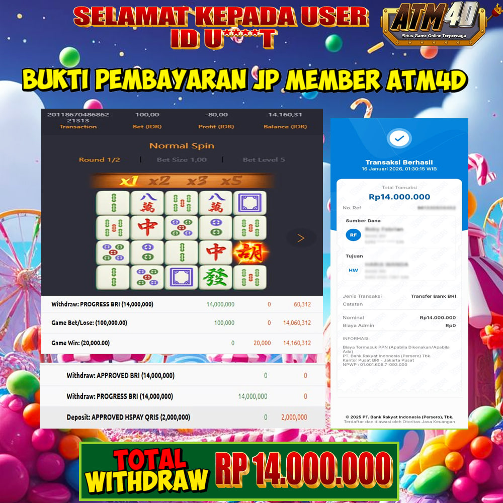 Jangan lewatkan kesempatan untuk meraih kemenangan besar. Daftar sekarang di ATM4D dan rasakan pengalaman bermain slot terbaik yang pernah ada! Putar gulungan, menangkan jackpot, dan jadilah bagian dari komunitas pemain sukses kami!
