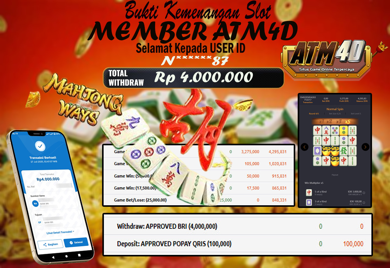 Jangan lewatkan kesempatan untuk meraih kemenangan besar. Daftar sekarang di ATM4D dan rasakan pengalaman bermain slot terbaik yang pernah ada! Putar gulungan, menangkan jackpot, dan jadilah bagian dari komunitas pemain sukses kami!