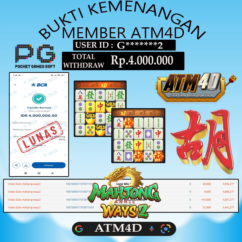 Jangan lewatkan kesempatan untuk meraih kemenangan besar. Daftar sekarang di ATM4D dan rasakan pengalaman bermain slot terbaik yang pernah ada! Putar gulungan, menangkan jackpot, dan jadilah bagian dari komunitas pemain sukses kami!
