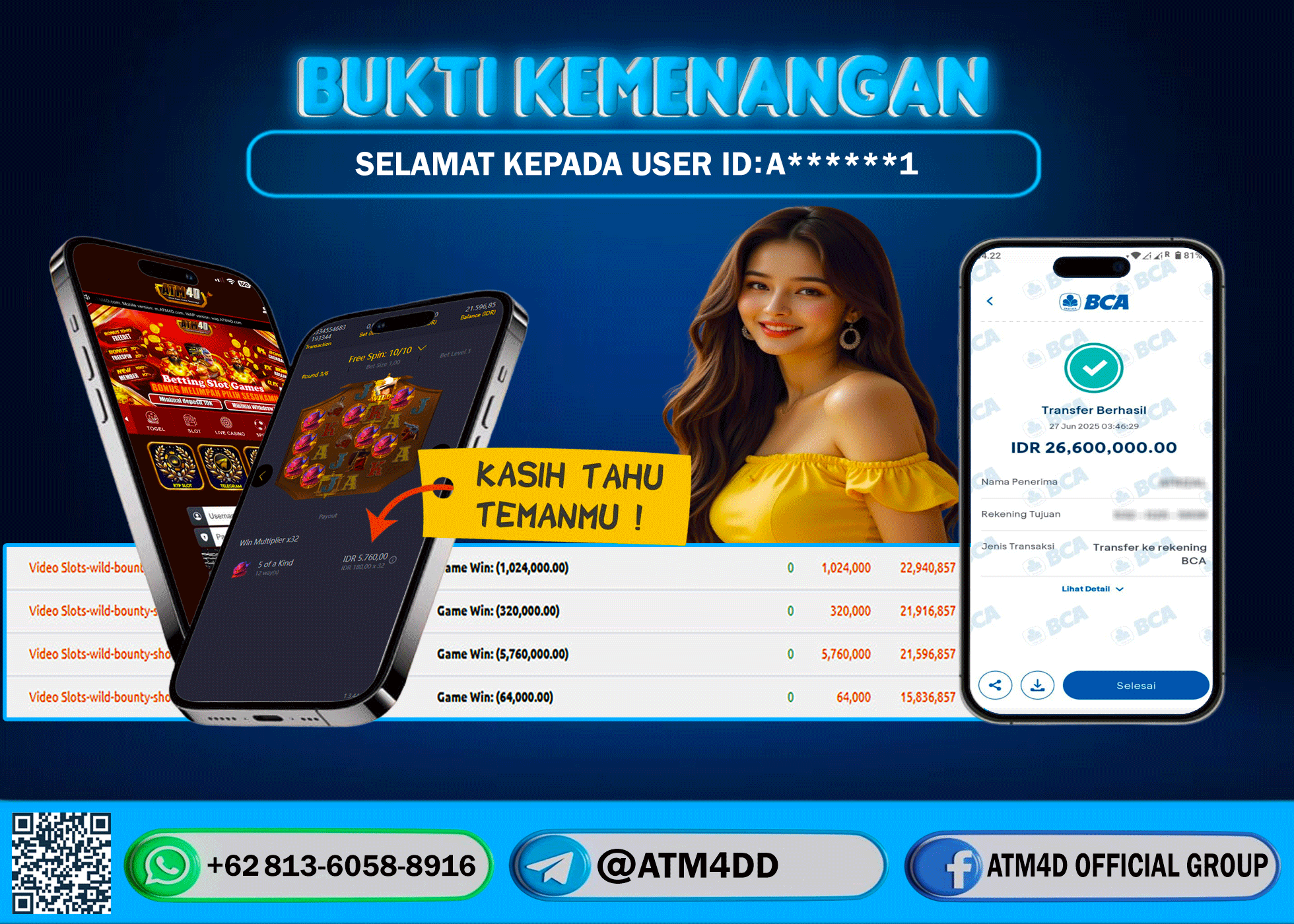Jangan lewatkan kesempatan untuk meraih kemenangan besar. Daftar sekarang di ATM4D dan rasakan pengalaman bermain slot terbaik yang pernah ada! Putar gulungan, menangkan jackpot, dan jadilah bagian dari komunitas pemain sukses kami!